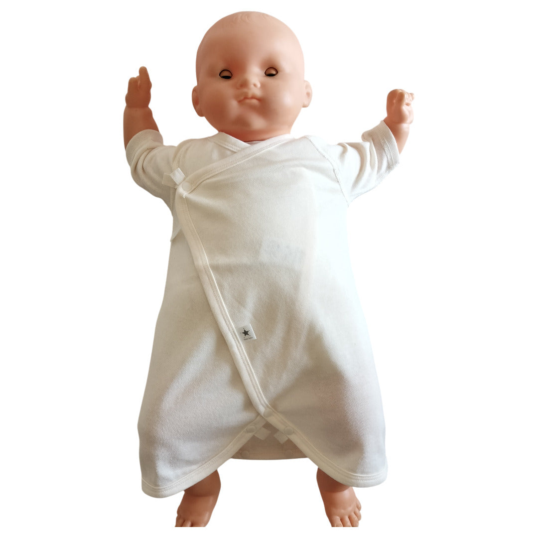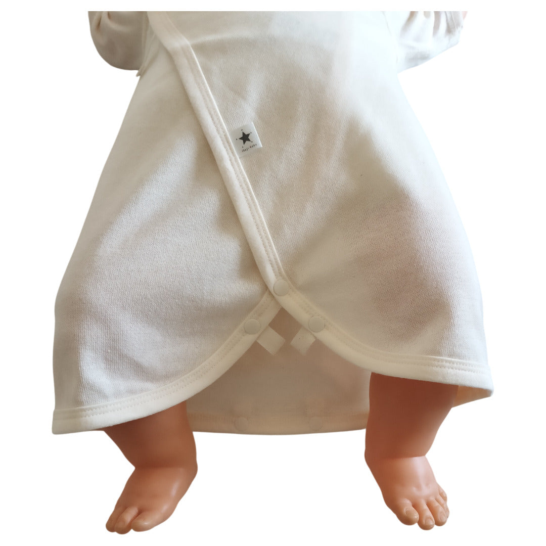 短肌着を改良した中肌着(ちゅうはだぎ)とコンビ肌着をボタン1つで切り替えられる新しいタイプの肌着です。股のボタンのはめ替えで2通りに使えるので、着せるときにどちらにしようかと迷う必要がありません。
