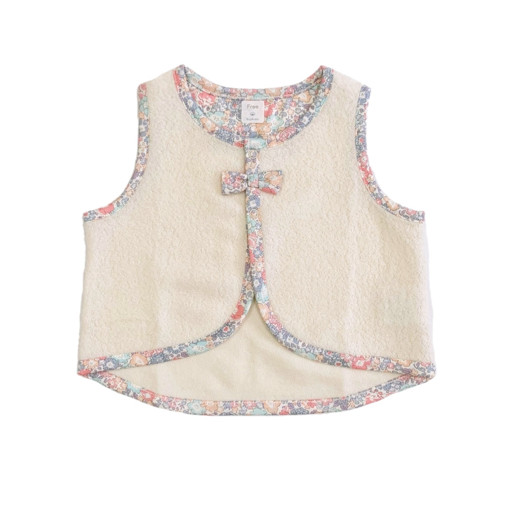 オーガニックのあたたかな起毛パイルにリバティの小花柄のリボン・バインダーで彩りを添えた可愛らしいベストです。