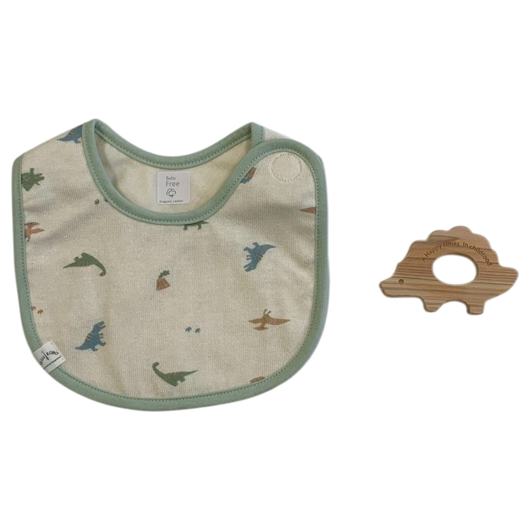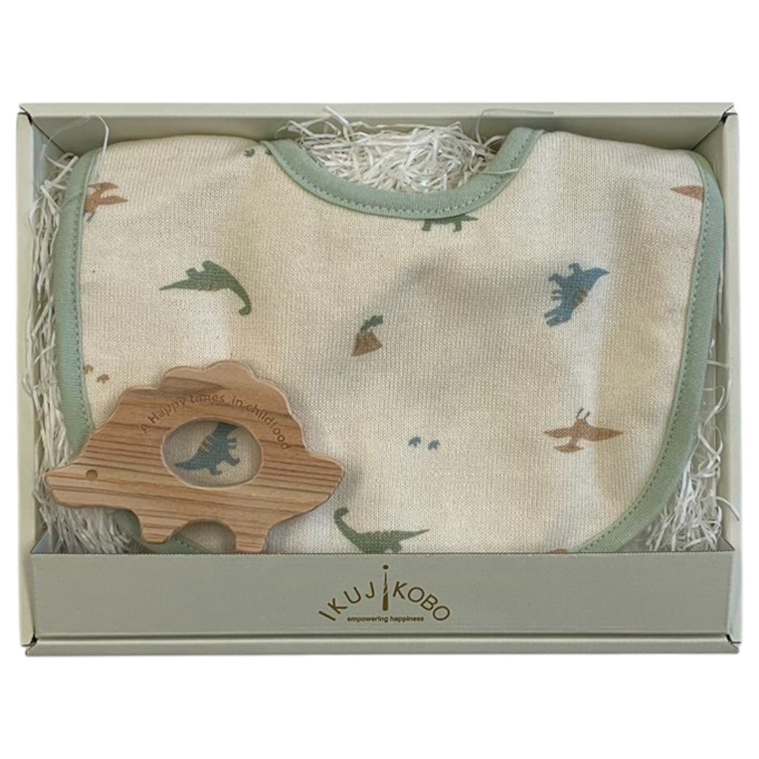 肌に触れるスタイは綿100%の柔らかな肌触り。日本の職人が丁寧に仕上げた安心品質です。天然ヒノキの歯固めは愛らしい恐竜デザイン。赤ちゃんの五感を優しく刺激し、健やかな成長を見守ります。