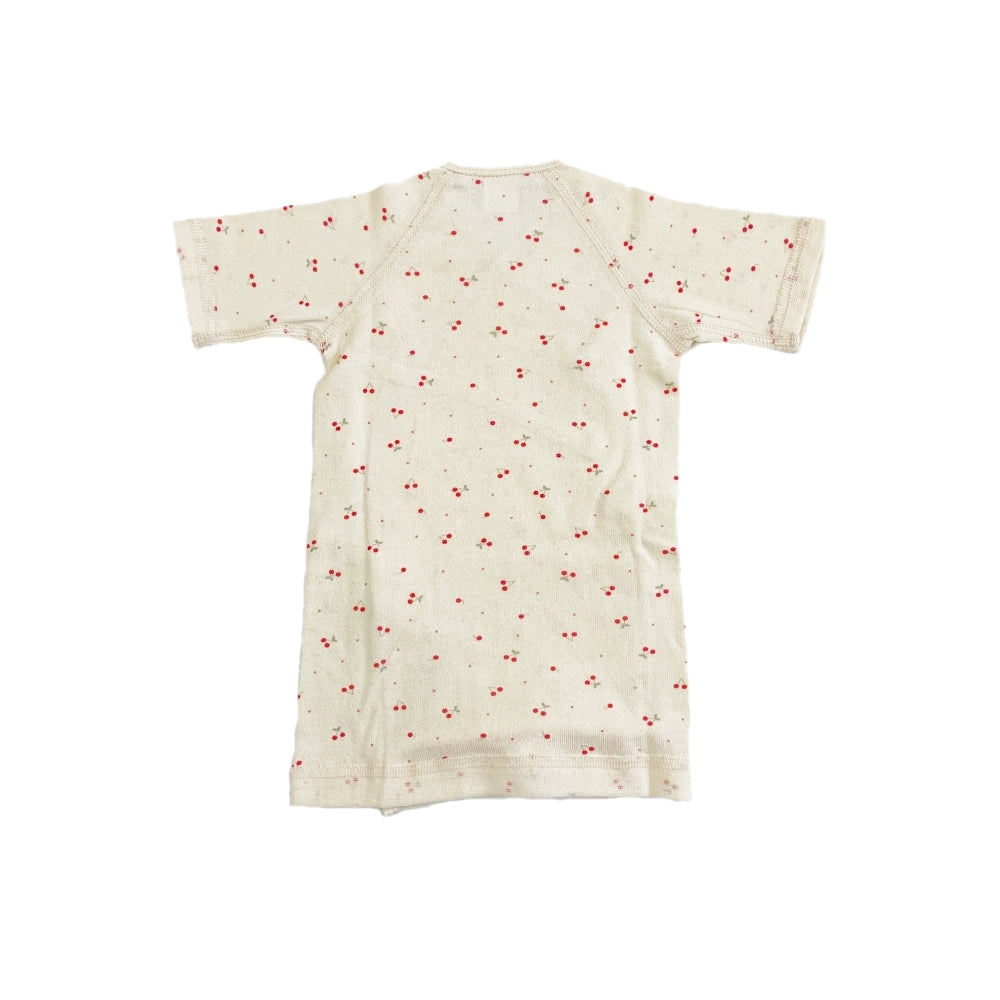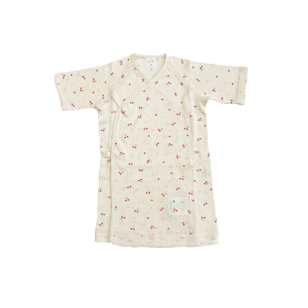 短肌着に比べ丈を8cm長くするとともに前で留める場所を1か所から2か所にすることによってお腹やおしりがはだけにくくしました。