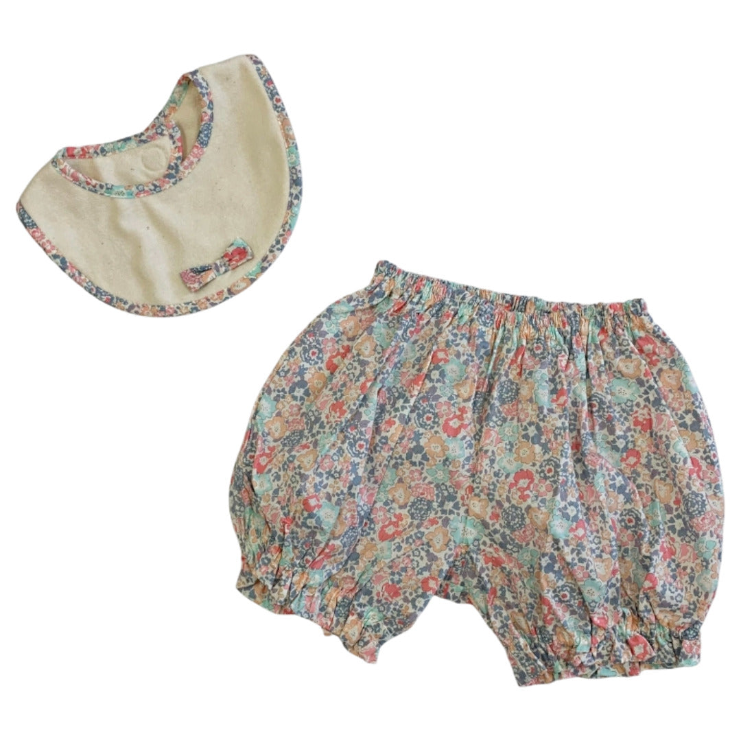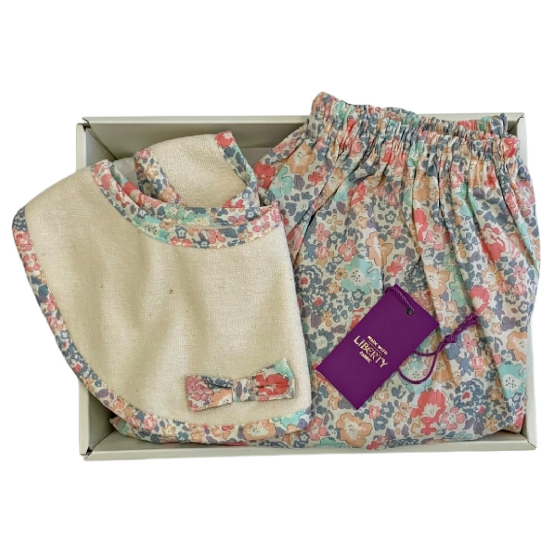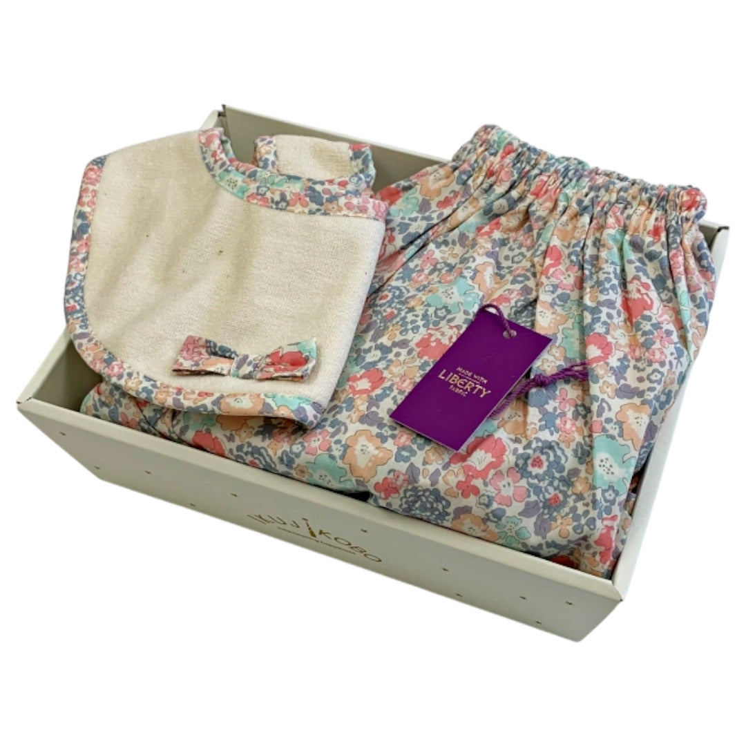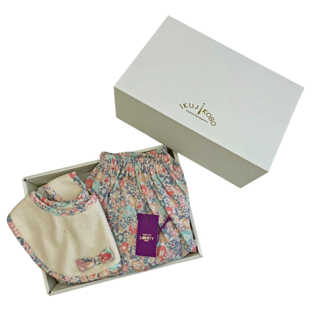 開けた瞬間に心が華やぐ、リバティプリントのスタイとパンツの組み合わせ。特別な出産祝いにふさわしい、心ときめく贈り物をお届けします。育児工房オリジナルボックス入りのギフトセットです。