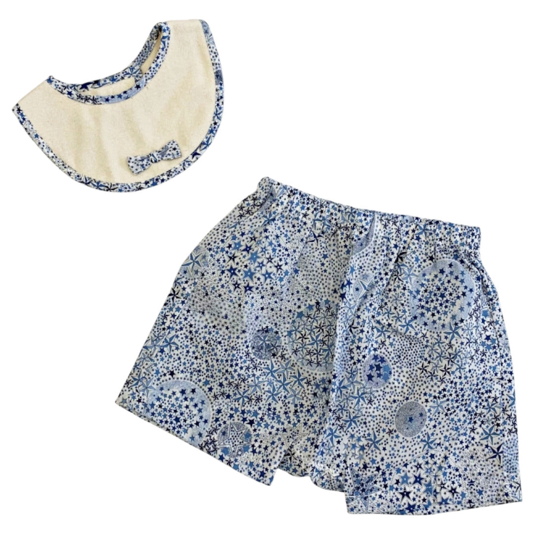 スタイはオーガニックコンパクトパイル、パンツは華やかなリバティプリントのタナローンを贅沢に使用。 綿100%の優しい肌触りが、赤ちゃんの動きを優しく見守ります。