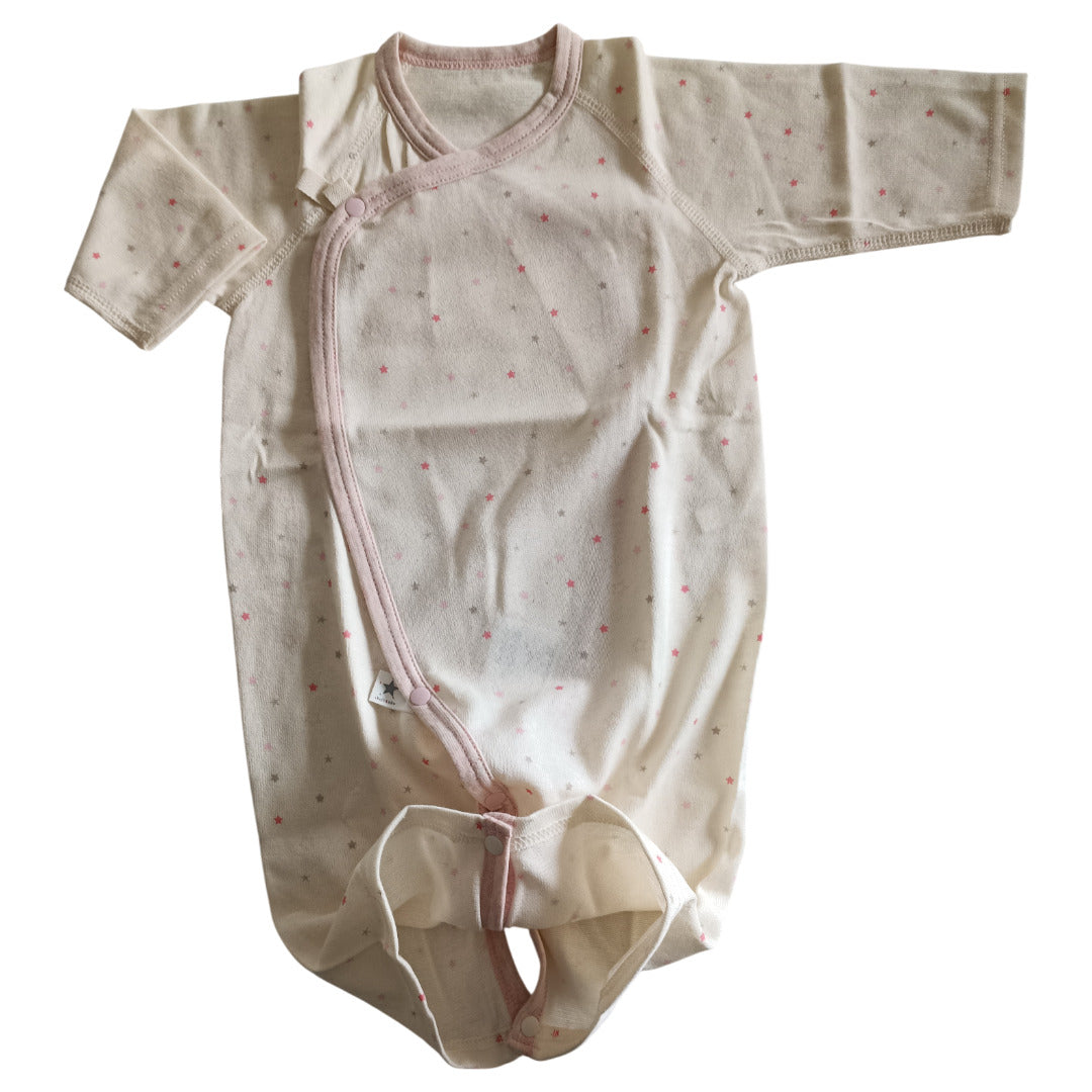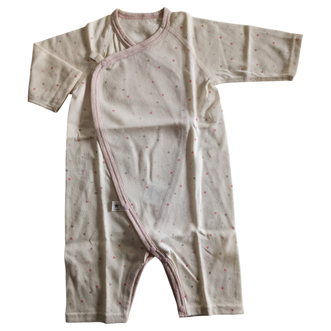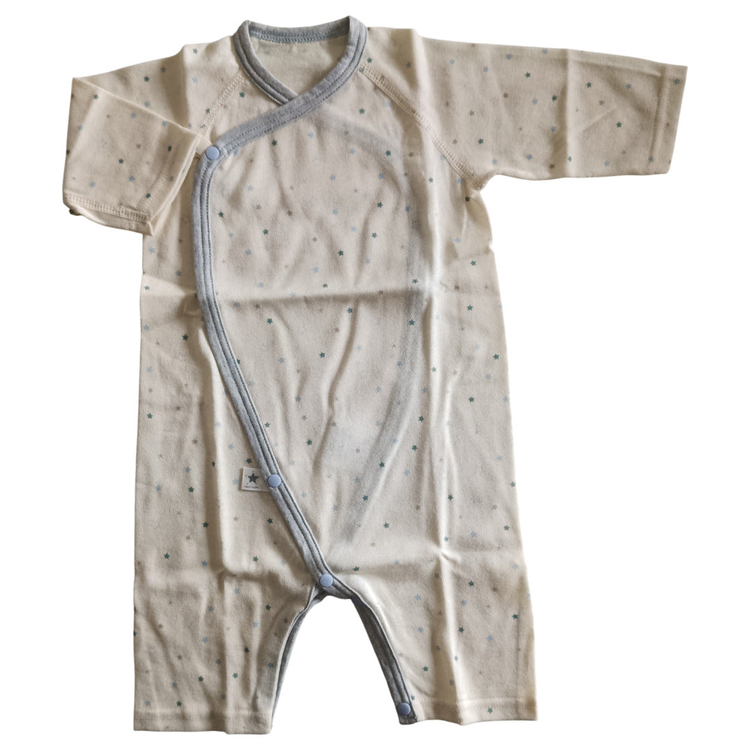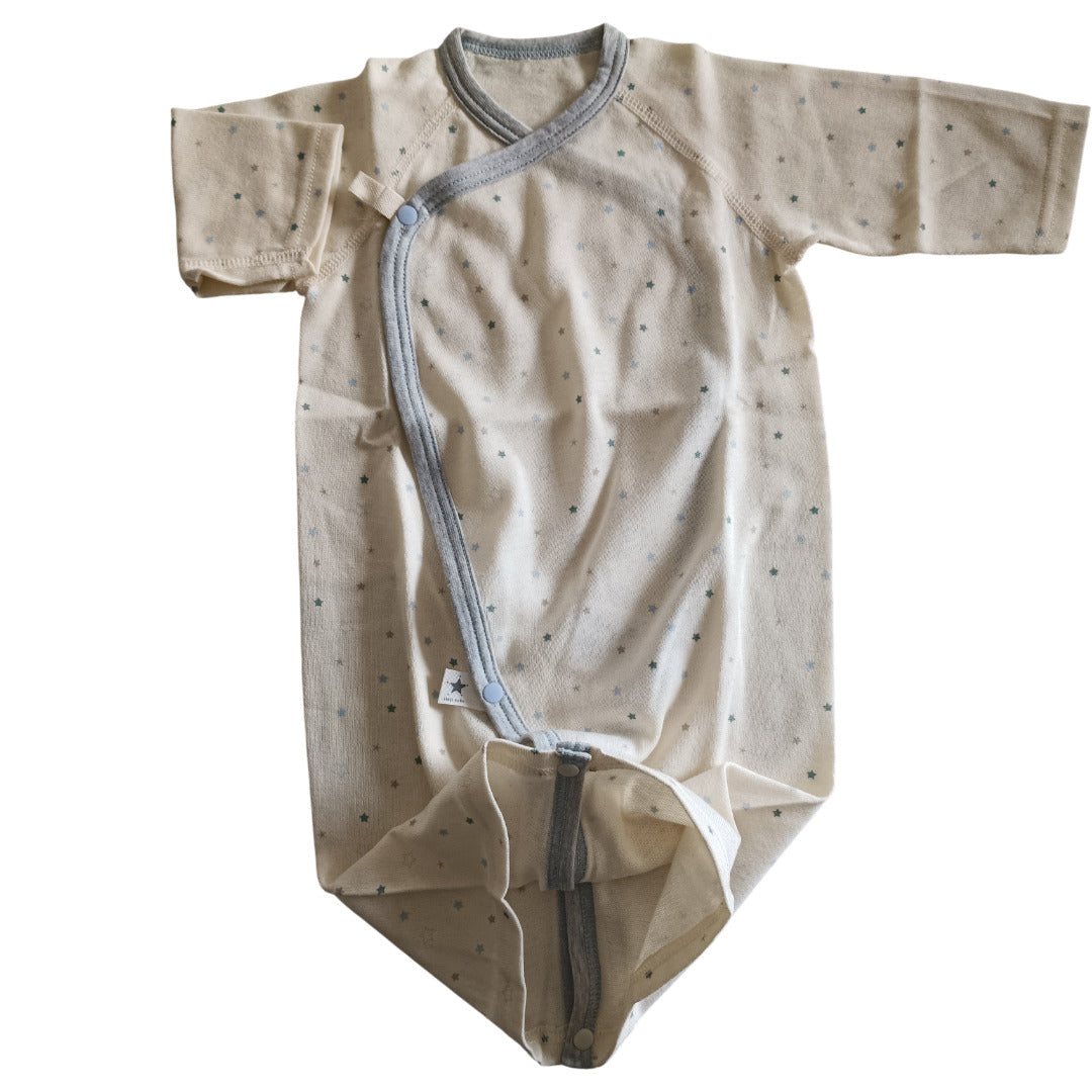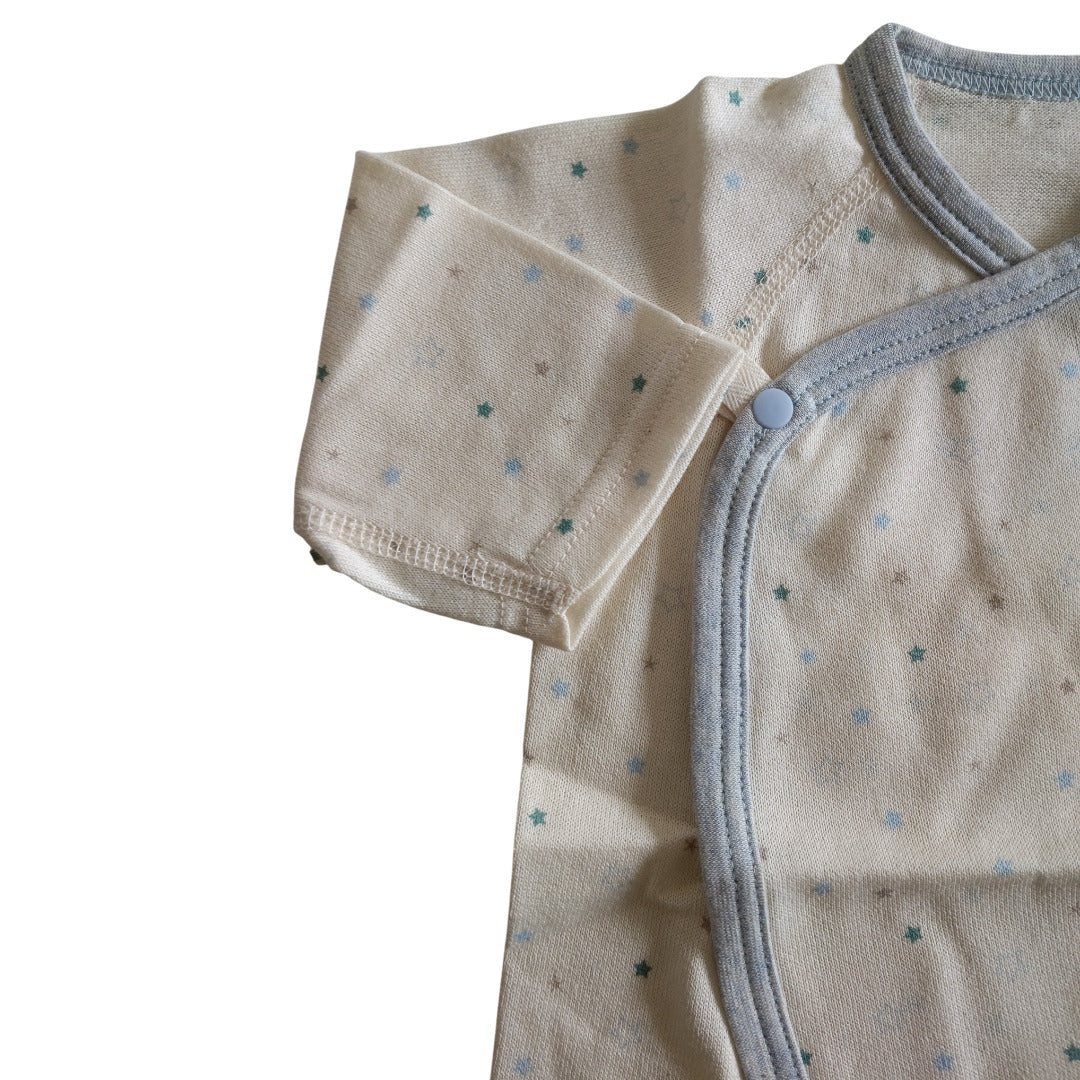 ふんわり柔らかなオーガニックコットンが、デリケートな肌を優しく包み込みます。コンペイトウ柄の小さな星たちが、赤ちゃんの毎日にそっと輝きを添える一枚です。