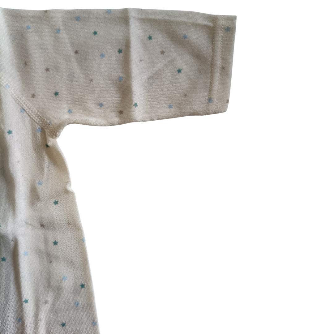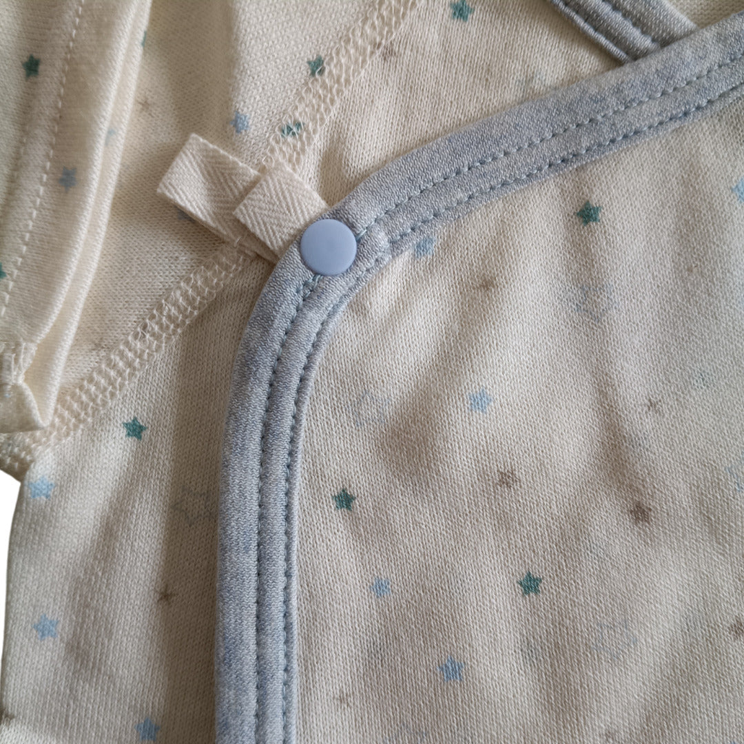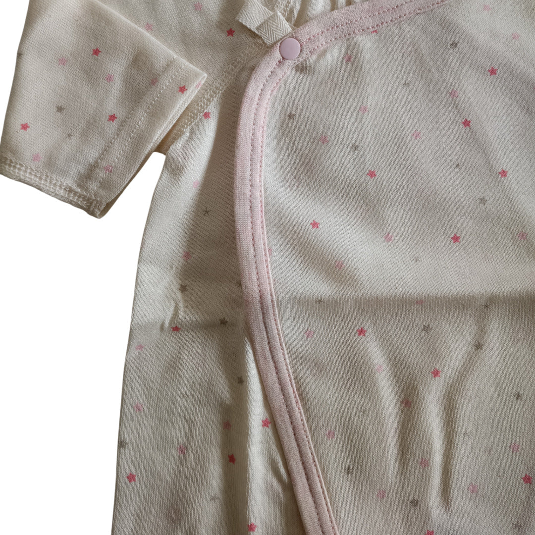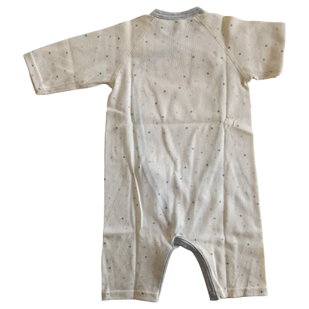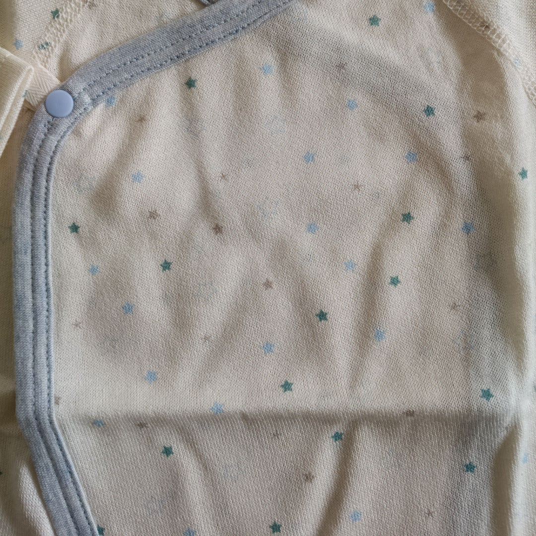 ふんわり柔らかなオーガニックコットンが、デリケートな肌を優しく包み込みます。コンペイトウ柄の小さな星たちが、赤ちゃんの毎日にそっと輝きを添える一枚です。
