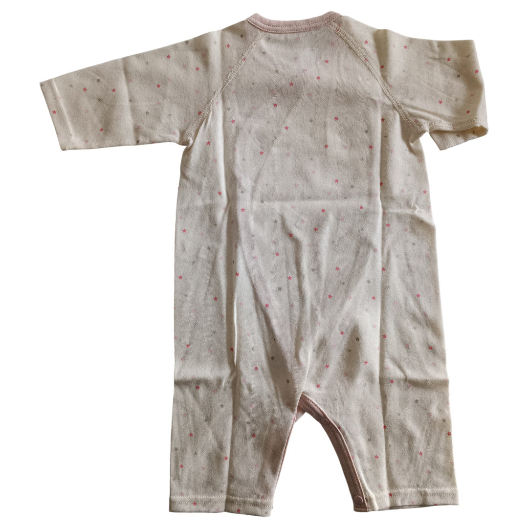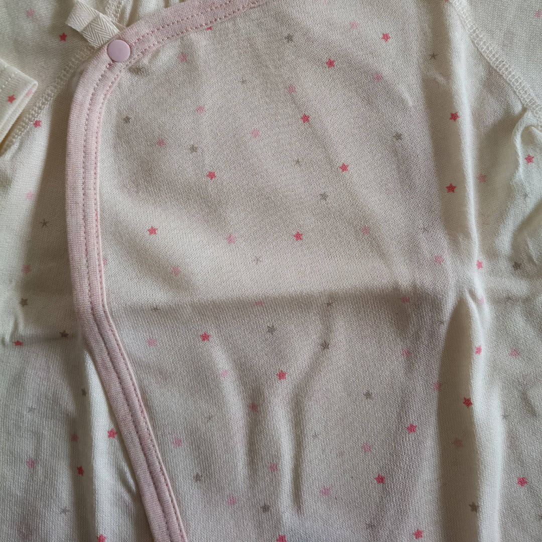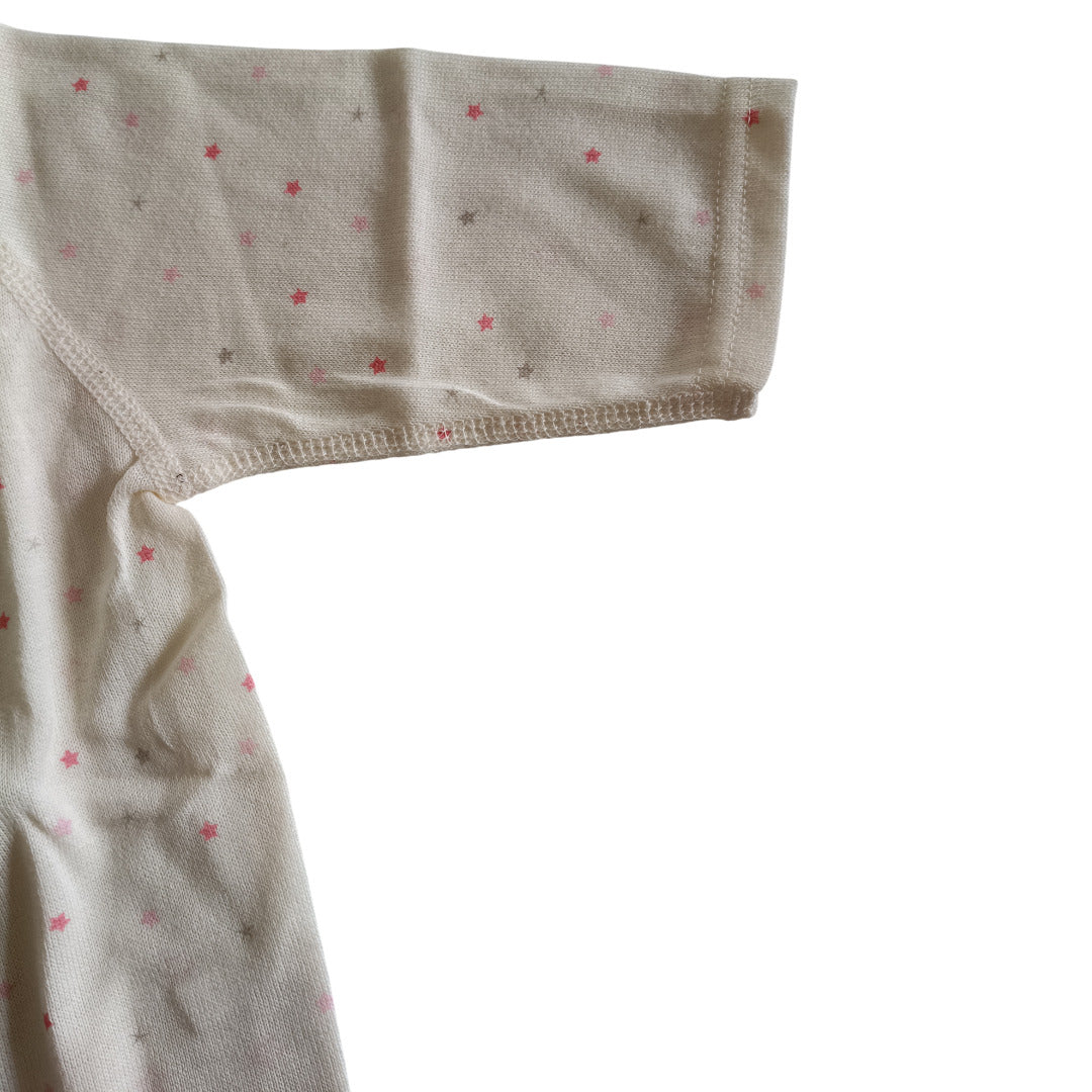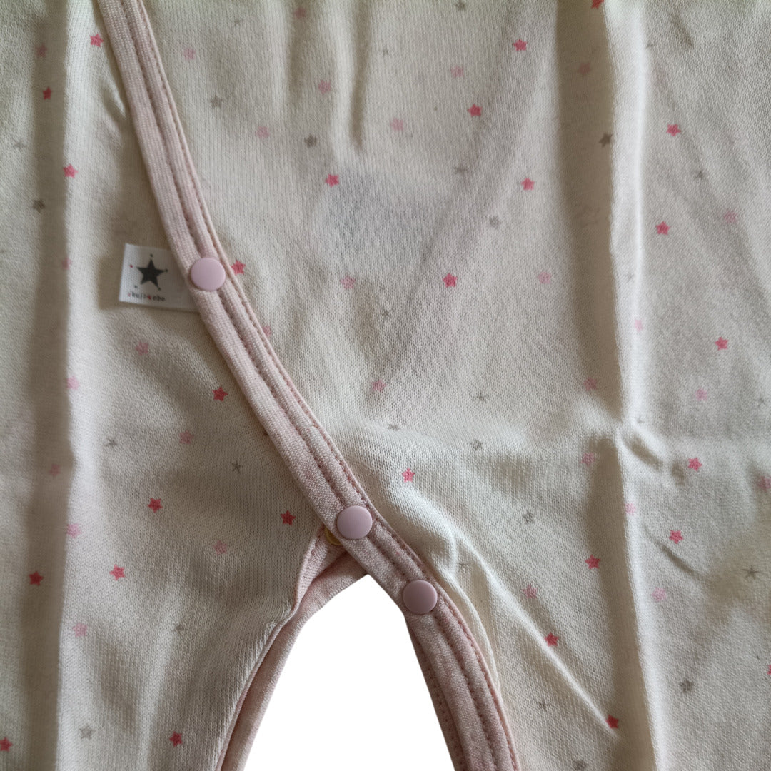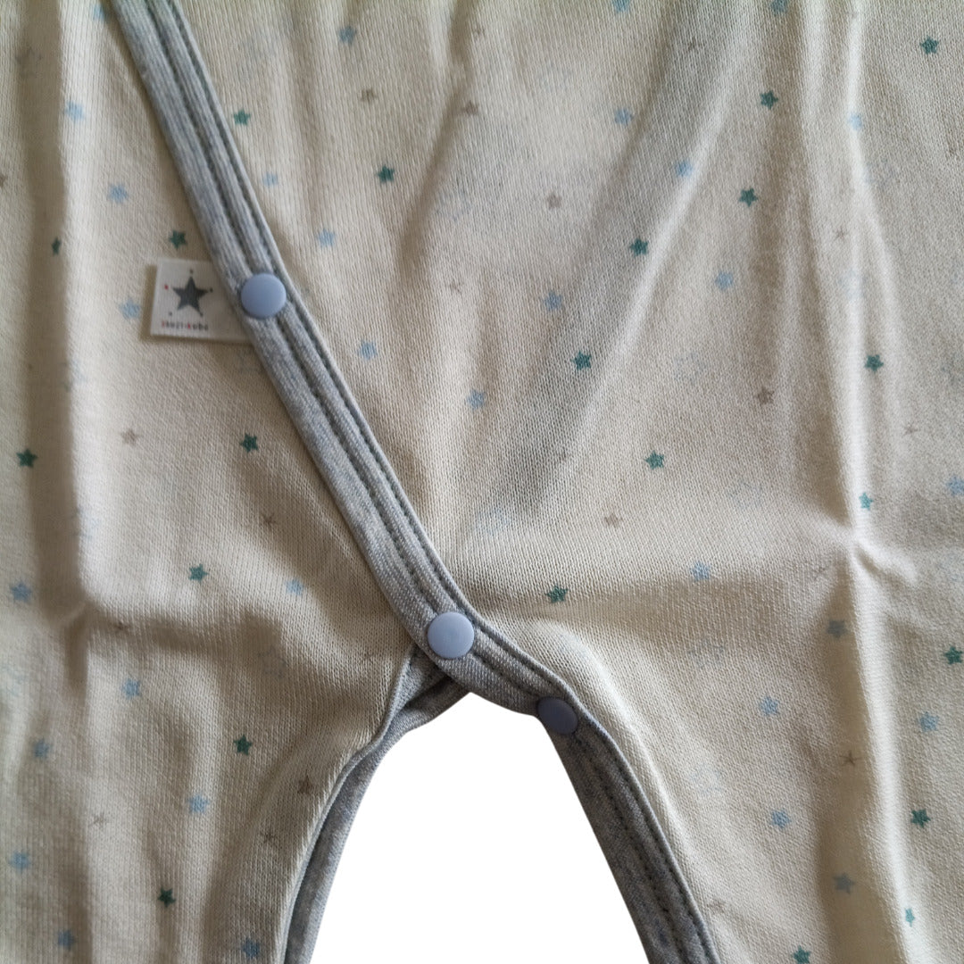 ふんわり柔らかなオーガニックコットンが、デリケートな肌を優しく包み込みます。コンペイトウ柄の小さな星たちが、赤ちゃんの毎日にそっと輝きを添える一枚です。