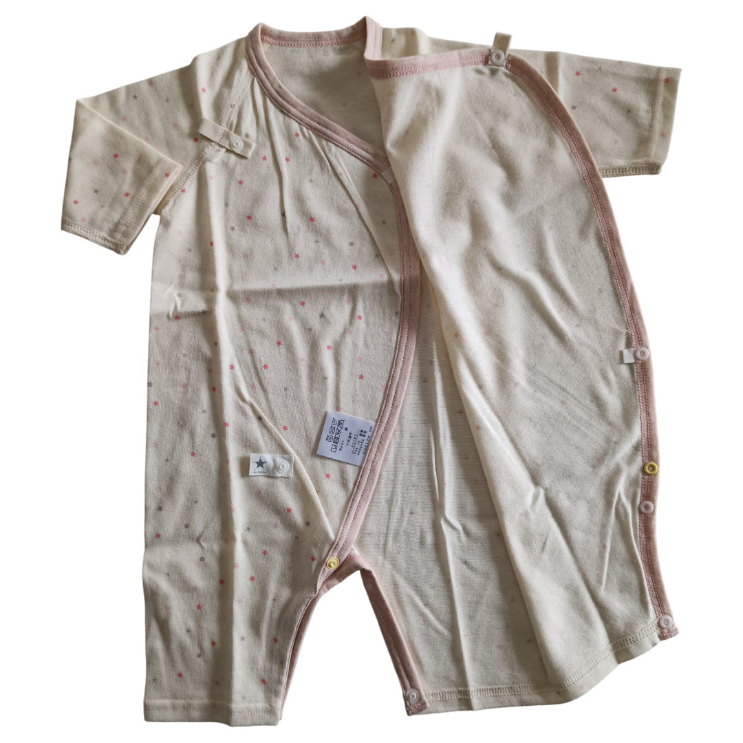 前開きのデザインとスナップボタンの配置で、日々のお着替えの時間をスムーズにします。赤ちゃんが心地よく過ごせるよう、細やかな配慮が行き届いた構造です。
